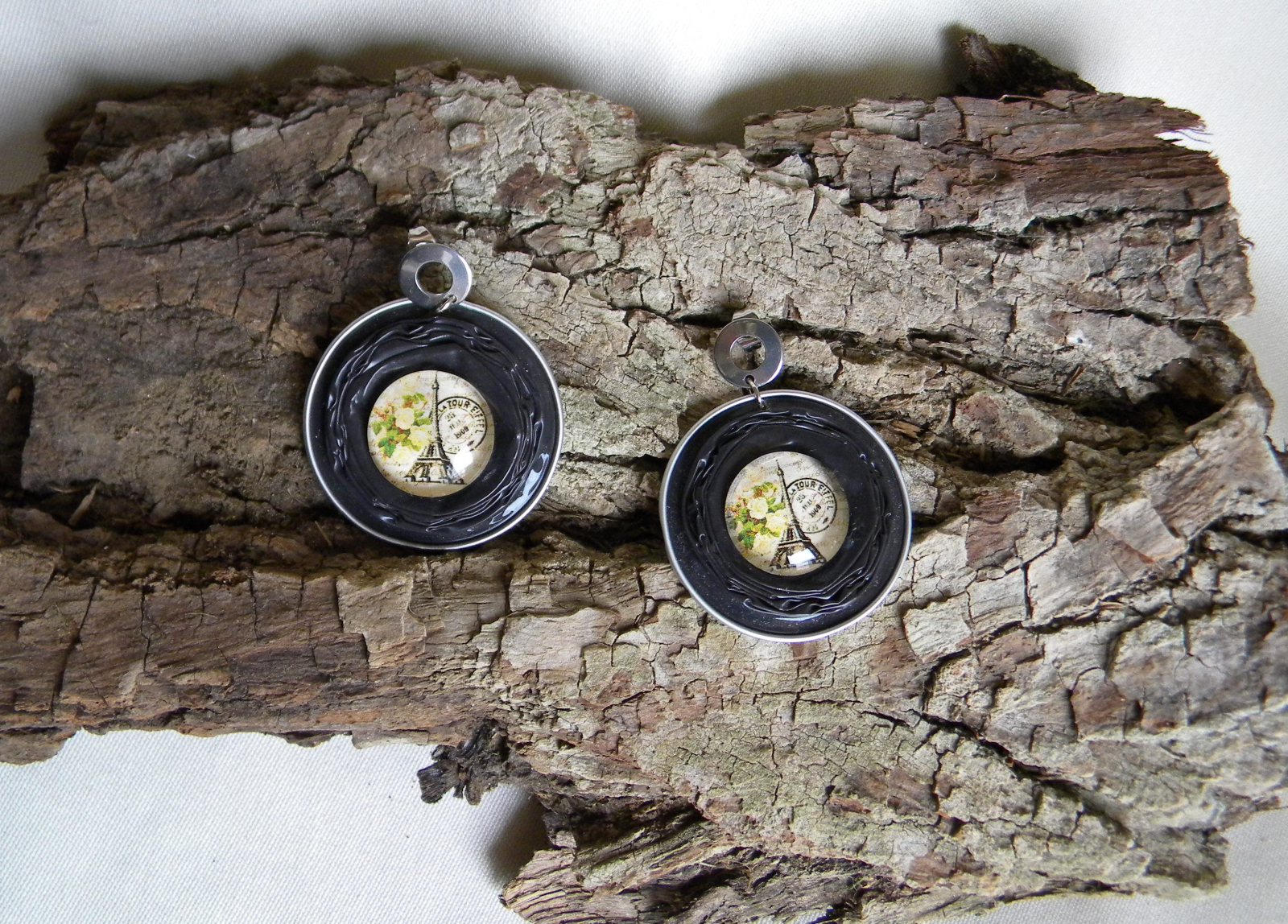 Cercei creati manual  din capsule de cafea (culoare maro si gri) in mijloc cu caboson (cu turnul eiffel) din sticla. Spatele este captusit cu alama.